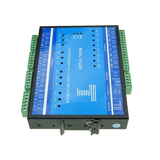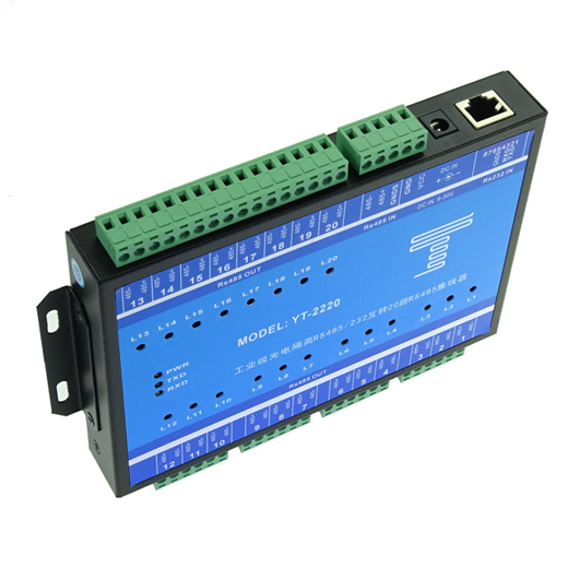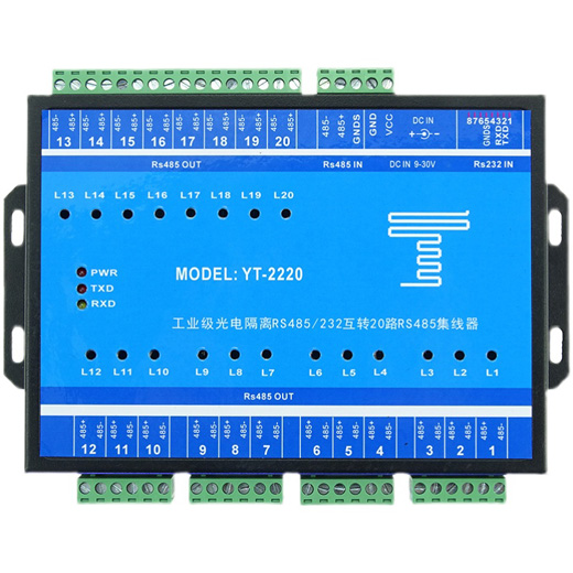一、產(chǎn)品概述YT-2220是一款專為解決復(fù)雜電磁場環(huán)境下RS-485 大系統(tǒng)要求而設(shè)計的RS-485 總線分割集線器(HUB)。該產(chǎn)品支持傳輸速率最高達115.2KBPS,為了保證數(shù)據(jù)通訊的安全可靠RS-485 接口端采用光電隔離技術(shù),防止雷擊浪涌引入轉(zhuǎn)換器及設(shè)備,內(nèi)置的光電隔離器及600W浪涌保護電路,能夠提供2500V 的隔離電壓,可以有效地抑制閃電(Lighting)和ESD,同時可以有效的防止雷擊和共地干擾,供電采用外接開關(guān)電源供電,安全可靠,非常適合戶外工程應(yīng)用。在RS-485 工作模式,采用的判別電路能夠自動感知數(shù)據(jù)流方向,并且自動的切換使能控制電路,輕松解決RS-485 收發(fā)轉(zhuǎn)換時延問題。RS-485 接口傳輸距離大于1200 米、性能穩(wěn)定。廣泛用于安防監(jiān)控系統(tǒng),門禁系統(tǒng),停車場管理系統(tǒng),高速公路收費系統(tǒng),道路監(jiān)控系統(tǒng)及電力采集系統(tǒng)中,是一款性能卓越,價格優(yōu)良的數(shù)據(jù)接口轉(zhuǎn)換產(chǎn)品。