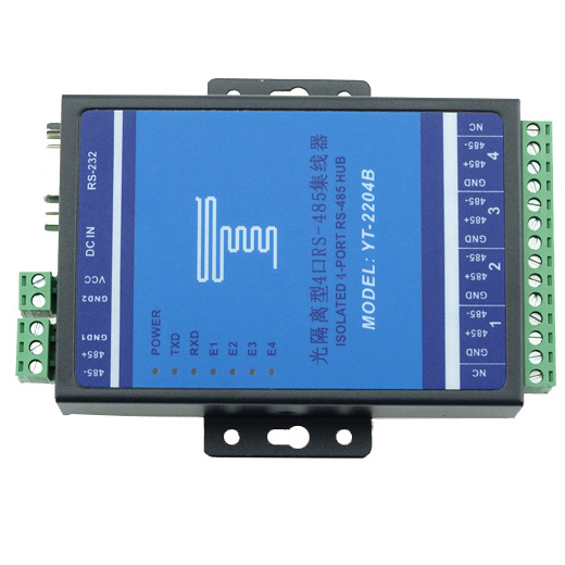 YT-2204B是一款4口工業(yè)級光隔離型RS-485集線器,YT-2204B四口光隔離型485集線器可以提供更加靈活的RS-485星型總線結(jié)構(gòu),RS-485接口輸入,輸出端均采用獨立驅(qū)動方式,改變原有總線的單一式結(jié)構(gòu)為網(wǎng)絡(luò)結(jié)構(gòu),給工程建設(shè)及系統(tǒng)的穩(wěn)定性帶來極大的好處。工業(yè)級光電隔離:為所有的RS-485接口提供2.5KVrms的光電隔離,有效的解決了外界雷擊浪涌和地電位差帶來的傳輸問題。數(shù)據(jù)流向自動控制,通過硬件解決數(shù)據(jù)流向問題,自動辨別和控制數(shù)據(jù)傳輸方向。 具有短路開路保護功能,具有RS-485端口故障報警功能,并能自動切斷故障端口,這種設(shè)計能夠保證當(dāng)其中連接的RS-485端口設(shè)備發(fā)生故障時,出現(xiàn)問題的RS-485端口將被隔離,以確保其他網(wǎng)段的設(shè)備正常工作