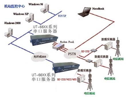 應(yīng)用UT-66XX系列串口通訊服務(wù)器,控制主機可以透過TCP/IP 網(wǎng)絡(luò)集中配置,可以管理分散的各個基站,與每個移動機站的RS232 通訊接口連接起來,將機站的環(huán)境狀態(tài)數(shù)據(jù)上傳給中心監(jiān)控主機。