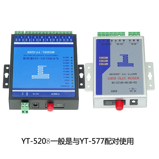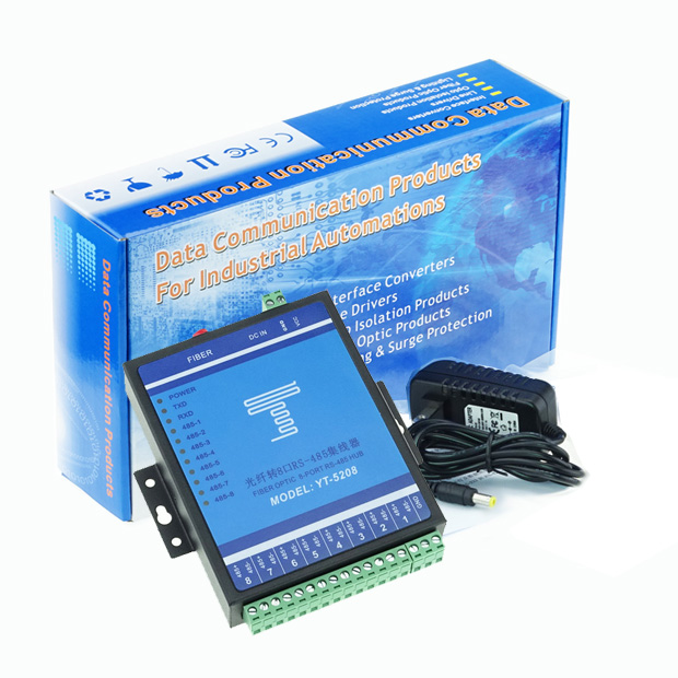 I、 Product Introduction:The YT-5208 single mode fiber optic to 8-port RS485 hub has strong anti-interference ability and long transmission distance, making it the first choice for large-scale 485 engineering projects. This product breaks through the contradiction between traditional RS-232/422/485 interface communication distance and communication speed, and also solves the problems of electromagnetic interference, ground loop interference, and lightning damage, greatly improving the reliability, security, and confidentiality of data communication. It can be widely used in various industrial control, process control, traffic control, and other occasions, especially suitable for banks, power plants, and departments and systems with special requirements for electromagnetic interference environments.