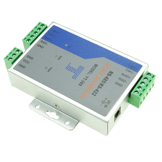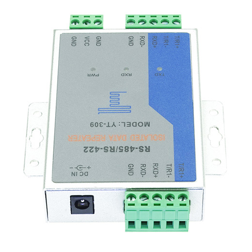 I. Product OverviewYT-309 photoelectric isolation type repeater, compatible with RS-422 and RS-485 standards, can extend the communication distance of RS-422/RS-485 bus network, increase the number of RS-422/RS-485 network devices. The built-in photoelectric isolator and DC/DC isolation module can provide an isolation voltage of up to 2500Vrms, and there are fast transient voltage suppression protectors at both ends of the interface. This protector is designed to protect the RS-422/RS-485 interface, The incoming TVS transient voltage suppressor is used. Under normal conditions, the TVS tube is in a high resistance state. When both ends of the TVS tube are subjected to transient high energy shocks, it can reduce the impedance at both ends at a very high speed, absorb a large current, clamp the voltage at both ends to a predetermined value, and protect the circuit components behind from damage due to transient high voltage shocks. This protector can effectively suppress lightning and ESD, providing a lightning surge protection power of 600W per line, as well as various surge voltages and transient overvoltages generated on the line due to various reasons. The extremely small interpole capacitance ensures high-speed transmission of the RS-422/RS-485 interface. The converter is equipped with zero delay automatic transmission and conversion, and its unique I/O circuit automatically controls the direction of data flow without any handshake signals (such as RTS, DTR, etc.). It does not require jumper settings to achieve full duplex (RS-422) or half duplex (RS-485) mode conversion, plug and play.
