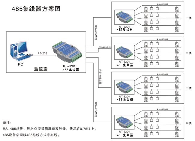 1)采用星型結(jié)構(gòu)連接RS-485總線,再有效利用接口的情況下布線覆蓋面積大大提高。