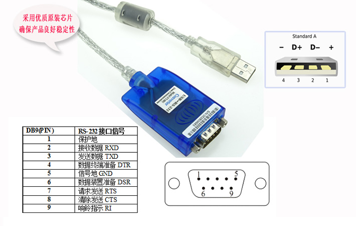 10、接口形式 :USB端A類接口公頭,DB9公頭的連接器連接